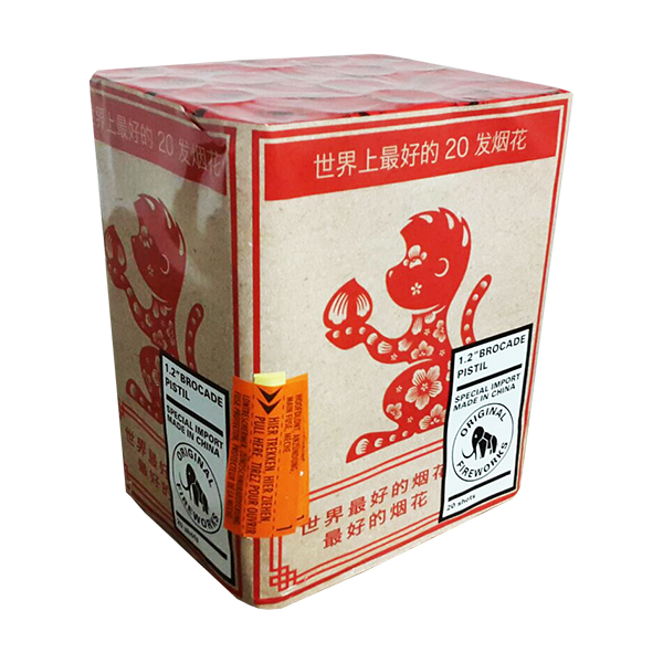 Een 20 schots batterij die blinkboeketten de lucht in schiet met centraal gouden horsetails.